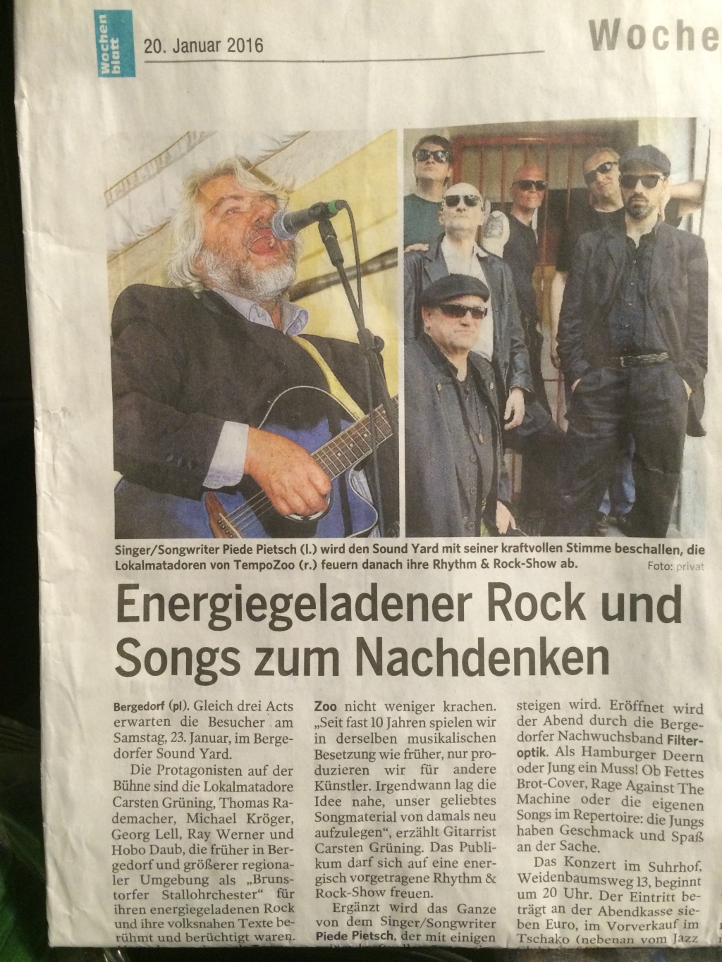 "Wir probten damals in einem Bordell bei Schwarzenbek", erinnern sich Drummer Michael Kröger (44) und Sänger Thomas Rademacher (52). Heute wollen sie nun nach vielen Jahren wieder gemeinsam die Bühne erobern: "Wir sind alt, aber nicht milde", heißt es, wenn im "Happy Billard" an der Kurt-A.-Körber-Chaussee 73 die Boxen dröhnen. Unter dem neuen Namen "Tempo Zoo" stellt die vierköpfige Band "energischen Rock" mit deutschen Texten vor.